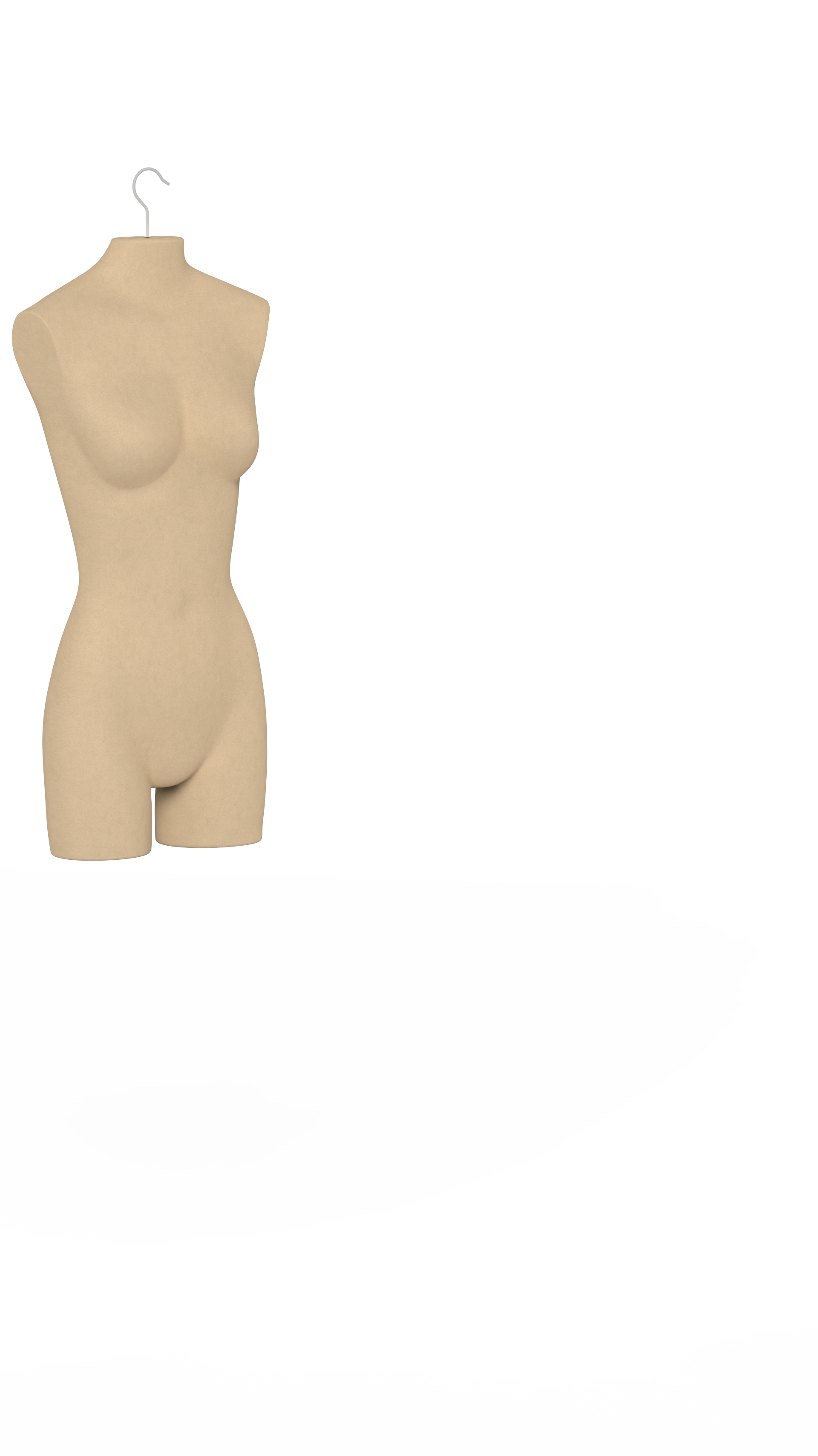 Display mannequin torso-hanger, with reduced depth and suspension device.
